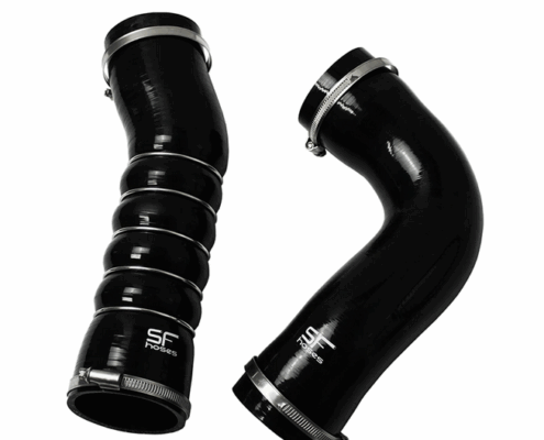 Diese beiden Silikonschläuche ersetzen die originalen Druckschläuche am Ladeluftkühler und überzeugen durch deutlich höhere Druckfestigkeit bei gleichzeitig hoher Flexibilität.
